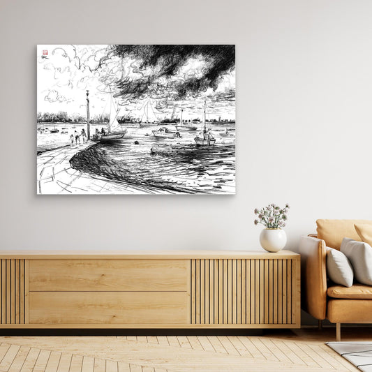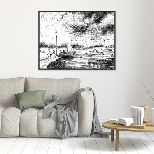 Canvas print of an ink sketch captured at Bosham sailing club just befor a race. Captured using a brush pen with black ink in my sketchbook en plein air. Canvas print details Canvas: Poly-cotton blend canvas with a matte/satin finish. Scratch, crack, and warp resistant. ...