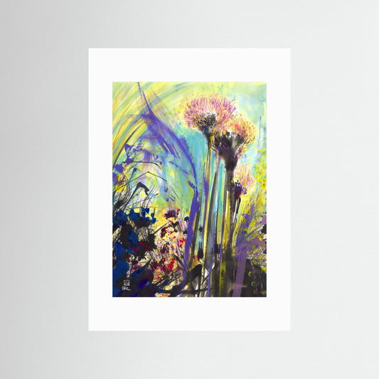 This fine art paper print is a reproduction of a painting of alliums in my garden. It was created using Chinese inks on Sumi paper then enriched with gouache and watercolour to vividly convey the luminous colours of the flower heads. Fine art paper print details Acid-...