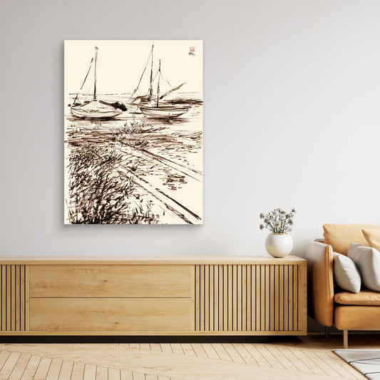 This canvas print features "Boats in the Mud at Blakeney," a scene from North Norfolk, England. The original ink sketch, created en plein air, captures the sailing boats of Blakeney with refined detail. Enhance your living space with this elegant depiction, evoking the serene atmosphere of coastal life. ...