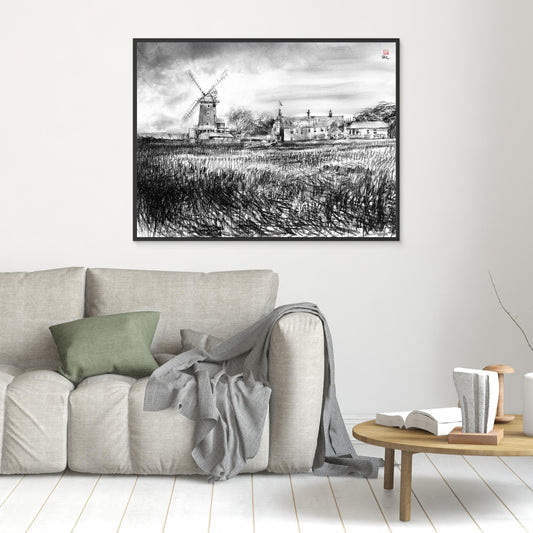 Canvas print of a charcoal drawing of Cley windmill in Norlfolk drawn en plein air on a windy day capturing the clouds race across the sky and the reeds flow like the sea. Canvas print materials details Poly-cotton blend canvas with a matte/satin finish. Scratch, crack, and...