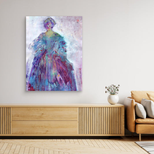 This canvas print showcases an expressive figure painting titled "Robe de cour," inspired by 18th-century fashion. Created with multiple layers of acrylic inks on large-format paper, the artwork reveals a sophisticated interplay of muted greens and rich burgundy tones, elegantly contrasted by a soft muted pink background. The delicate yet...