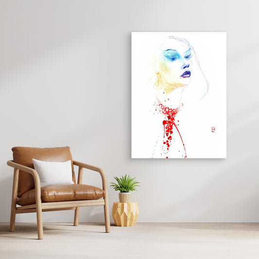 This canvas print features a sophisticated fashion illustration of a blood red necklace, evoking a striking vampire-inspired theme. Created using inks and colored pencils on paper, the artwork captures rich hues and intricate detailing, making it a captivating addition to any stylish interior. Ideal for those who appreciate a blend...