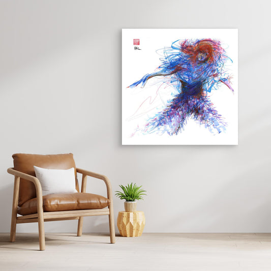 This canvas print features a sophisticated fashion illustration inspired by Capaldi’s couture creations. The artwork captures the dynamic movement and elegance of feathered trousers through loose, expressive strokes in rich blues and purples. Ideal for those who appreciate high fashion and artistic flair, this piece adds a refined energy and...