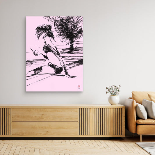 This canvas print features an ink sketch of a girl lounging by a pool in Greece, absorbed in her phone. Rendered in a vibrant pink palette inspired by Barbie, it offers a stylish twist for pink enthusiasts. Capturing a serene poolside moment, this drawing reflects a refined appreciation for everyday...