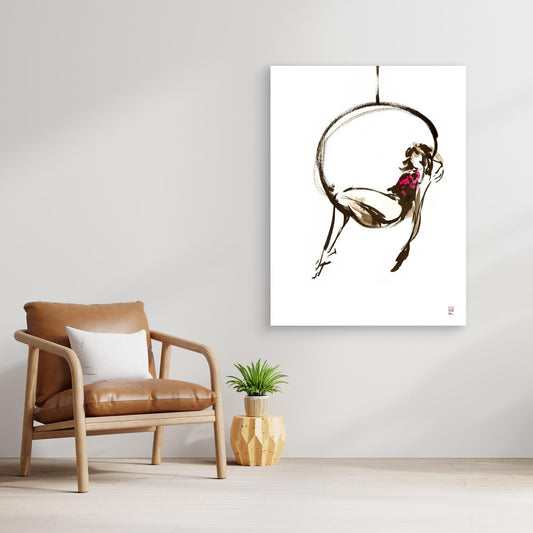 This canvas print features "Hanging out," a refined gestural ink painting depicting a girl poised inside a hoop. Created live at The Drawing Circus, the artwork captures a moment of quiet elegance and movement. Painted with a traditional Chinese brush using Japanese ink on delicate Fabriano paper, it combines simplicity...