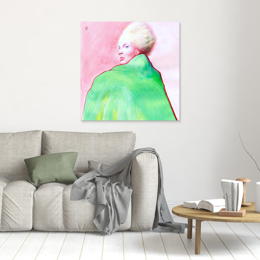 This canvas print showcases a conceptual painting that breaks down the figure into complementary green and pink hues, drawing from early portraiture styles. Inspired by a fashion drawing session with designs by Min Jim Kim, the work emphasizes minimalism through the careful reduction of lines and shapes. ...
