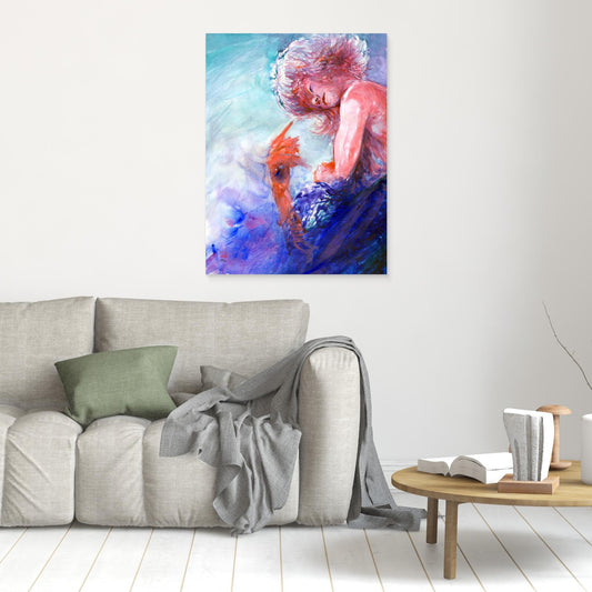 Canvas print of a painting in watercolor of the model Janet Mayer from Drawing Cabaret Couture. She posed in a dress from a water them so I let the Japanese flow blending between aquamarine blues, pinks and turquoise.