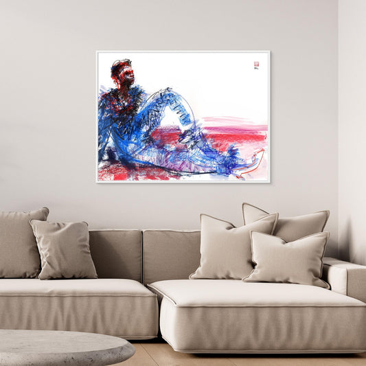 Canvas print of a male fahion figure in repose. Captured in an online live drawing session in blue and red pastel and colored pencils on paper. Using expressive loose mark making to exude energy.