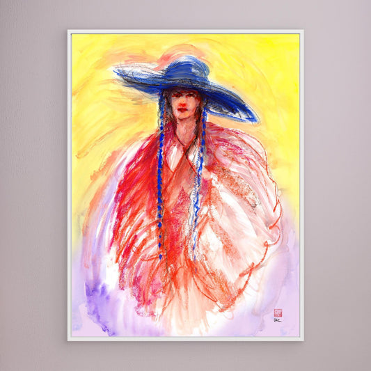 Canvas print of a painting from my imagination on a Spanish theme. Playing with a female figure sporting a blue hat and pigtails and bright high chroma yellows, reds and blue.