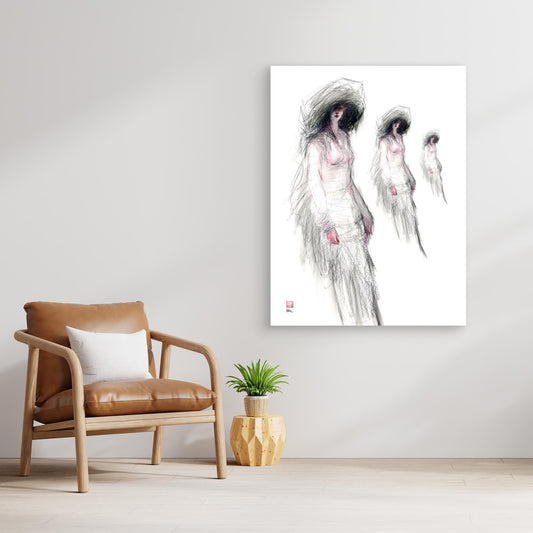 Canvas print titled Fashion in Time. This sophisticated fashion illustration, inspired by models from Drawing Cabaret Couture, features a repeating figure gradually retreating into time, reminiscent Jean Cocteaus mirrored reflections. The figure turns to gaze back, gently fading into the past. Canvas print details Our premium canvas...