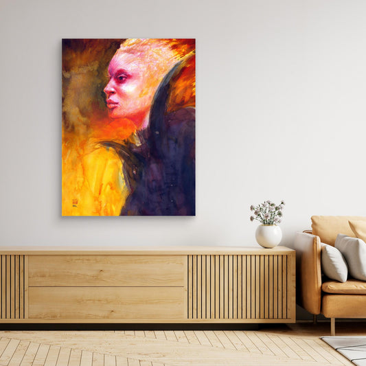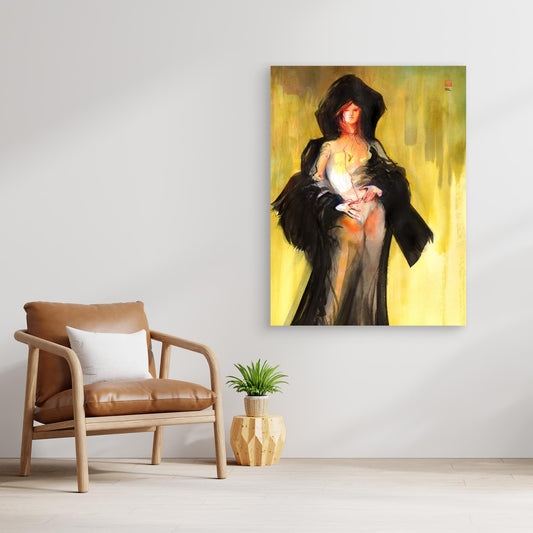 This canvas print features a fashion illustration of a female figure draped in a voluminous black hooded cloak set against a glowing yellow backdrop. The design emphasizes drama and highlights the elegant contours of her pose, with hands confidently placed on her hips. Created in a dynamic 30-minute session with...