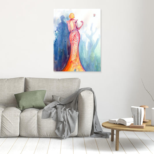 This canvas print features a fashion illustration inspired by designer Julia OCallaghan’s ‘White Look’ collection, showcasing a dress crafted from deadstock upholstery fabric treated with clay and paint. Modeled by Nandi during a Drawing Cabaret Couture session, the artwork captivates with its striking contrast of vivid oranges set against a...