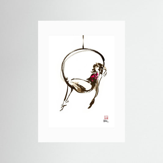 Canvas print featuring "Hanging out," a refined gestural ink painting depicting a girl sitting inside a hoop. Painted live at The Drawing Circus, the artwork captures a moment of quiet elegance and movement. Painted with a traditional Chinese brush using Japanese ink on delicate Fabriano paper, it combines simplicity with...