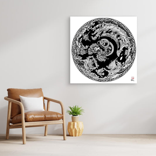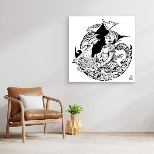 Canvas print of Jason and the golden fleece. The illustration depicts scenes within the story as you go round the circular black and white image. The original artwork was drawn with a dip pen and black indian ink on board. Purchase a large canvas print to get the true benefit...