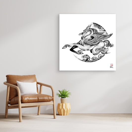 Canvas print of 'Pegasus' from the Greek Myth series. Original illustrations were drawn with dip pen and indian ink on board. One of a series of 8 designs in the series. Our premium canvas prints are crafted using museum-quality giclée printing technology, ensuring exceptional detail and color accuracy...