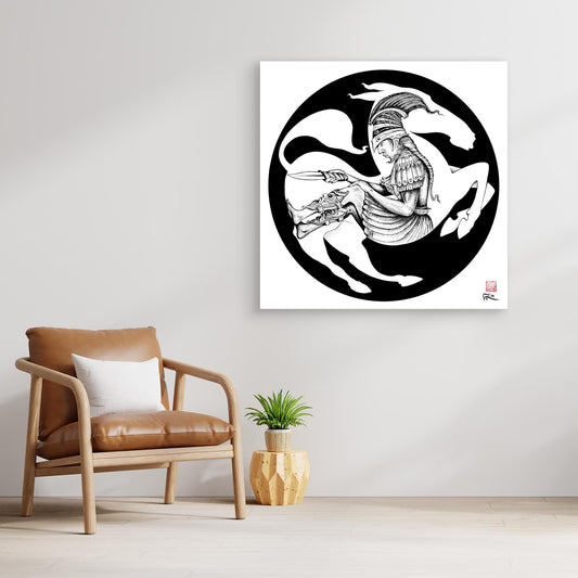 Canvas print of a 'Centaur' from the Greek Myth series. Original drawn with a dip pen in indian ink. One of a series of 8 designs. Our premium canvas prints are crafted using museum-quality giclée printing technology, ensuring exceptional detail and color accuracy that brings your artwork to...