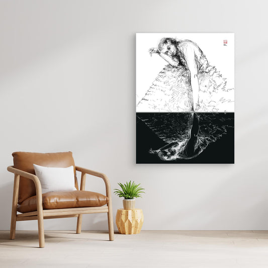 Canvas print of a reimagining of Cindarella in contemplation, seeing the reflection of her life. Drawn using a fine line black marker from the model in a 20min pose with Drawing Cabaret Couture.
