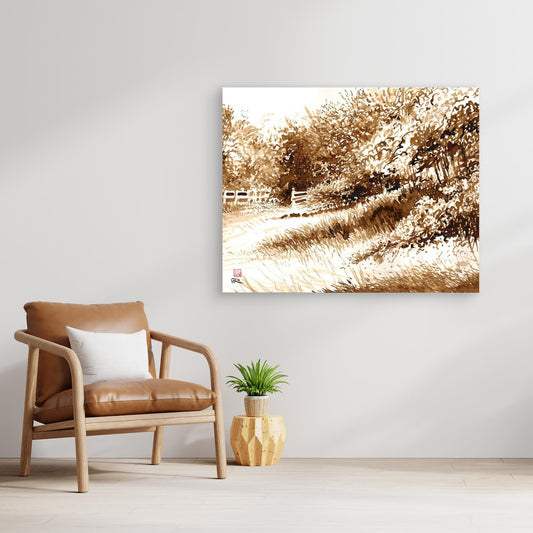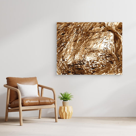 Canvas print of a reed pen drawing of a willow tree over my friends pond in my village in Ludgershall. Drawn on location in the summer of 2025 using walnut ink on A4 fabriano paper. I made the reed pens from old bullrushes from the pond in the same way...