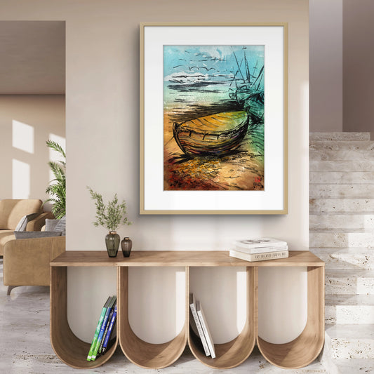 Dieser Kunstdruck ist eine Reproduktion einer Radierung eines „Norfolk-Krabbenboots – Auflage 2“, die ich während einer Skizze auf einem Spaziergang entlang des Küstenwegs zwischen Blakeney und Cley an der Nordküste Norfolks festhielt. Die Boote säumen das Ufer des Kanals, der zum Meer hinunterführt.