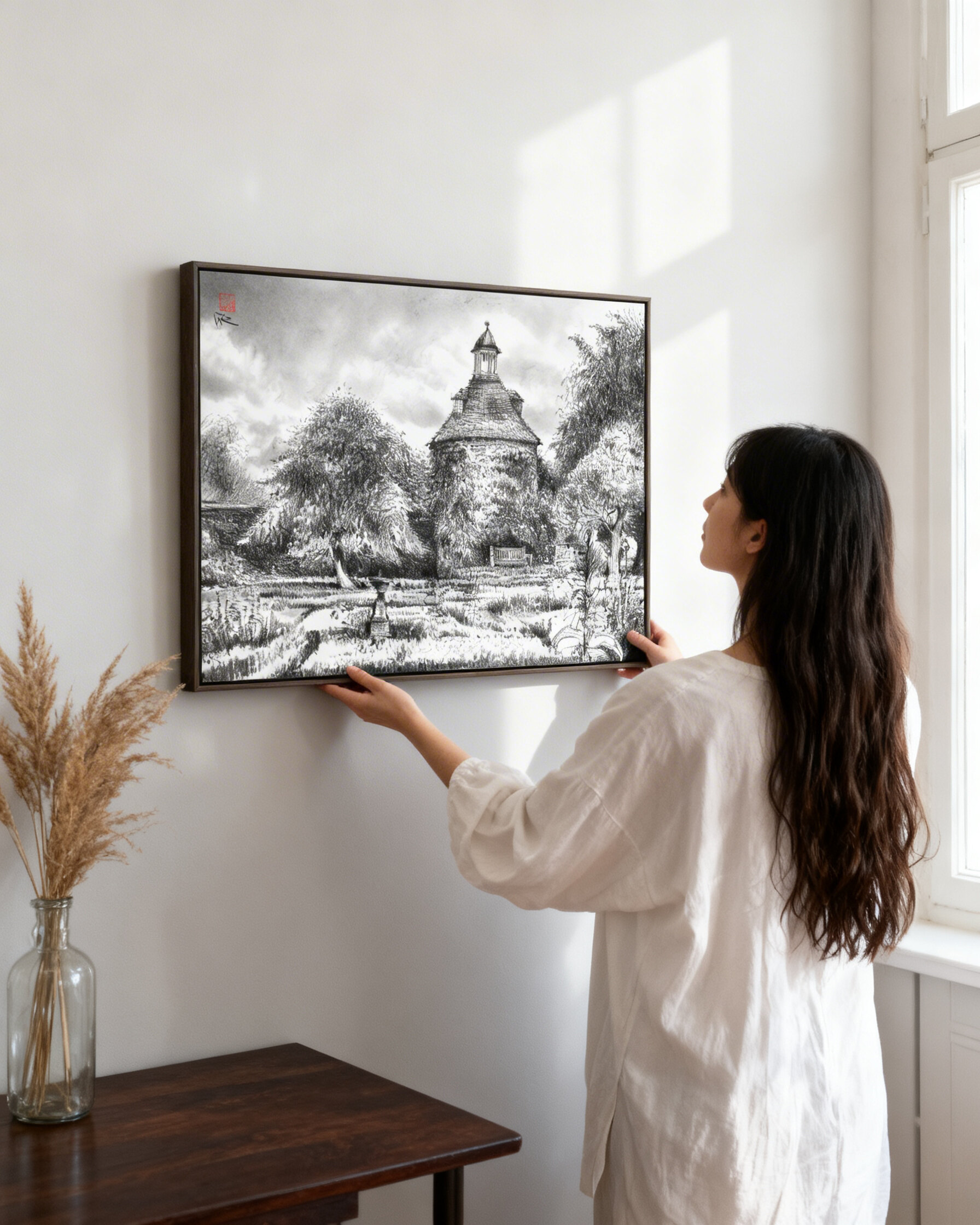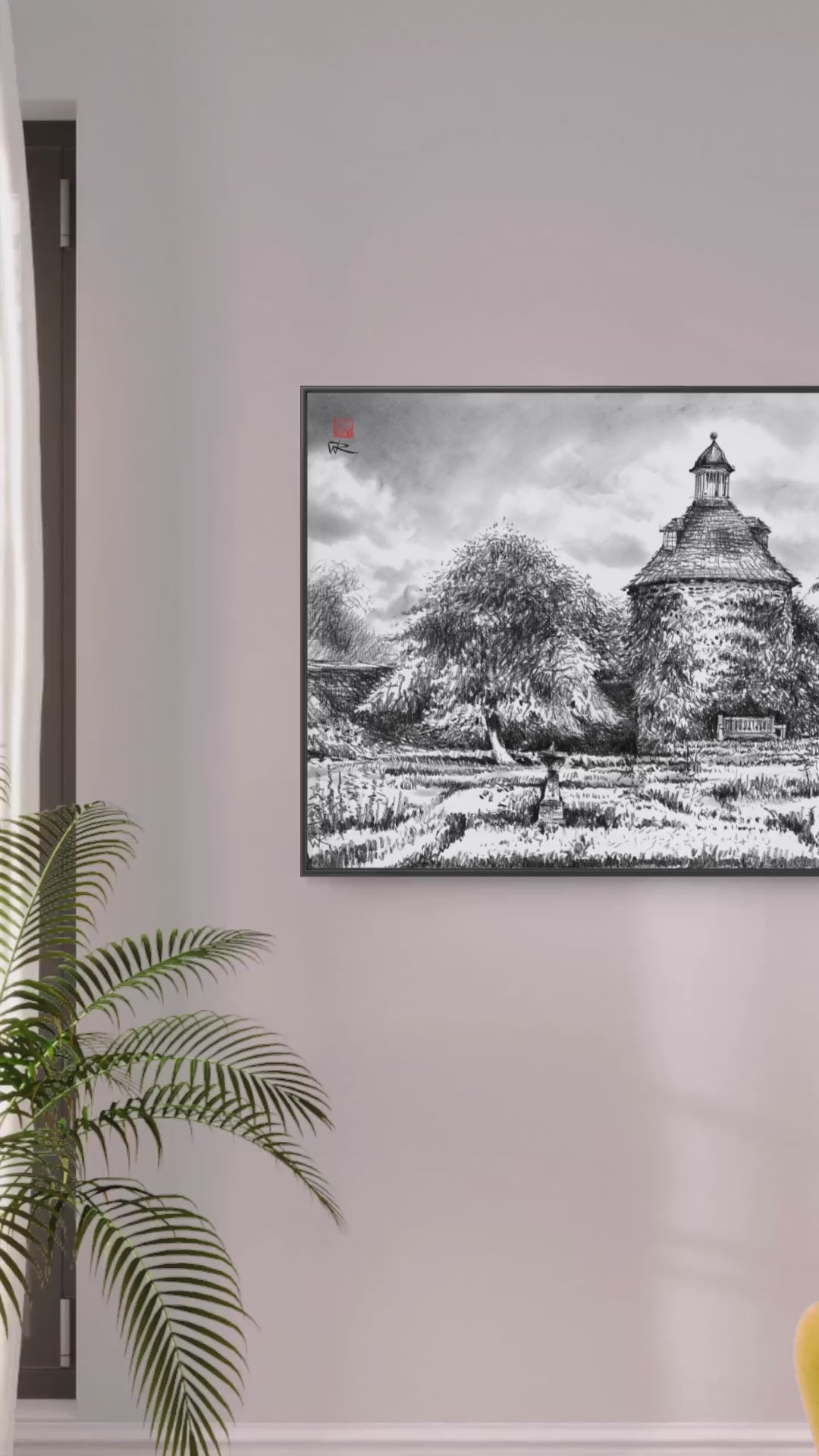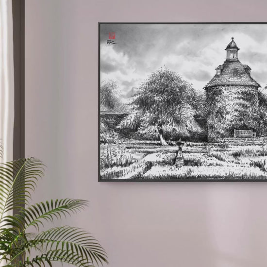 Dieser Papierdruck ist eine Reproduktion einer originalen Kohlezeichnung von „Das Taubenhaus“ in den Rousham Gardens in Oxfordshire, England.