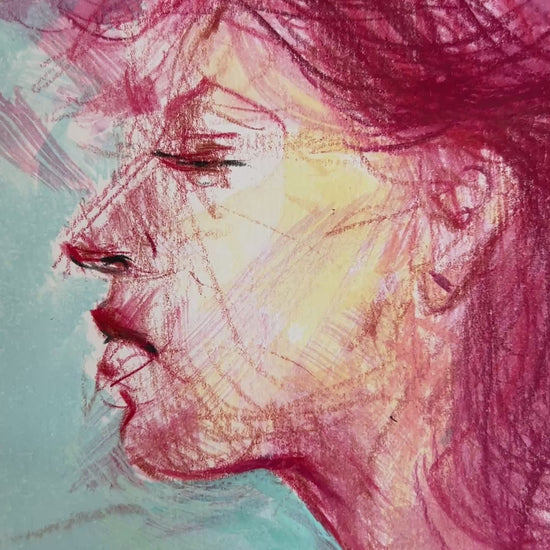 This paper print is a reproduction of a life drawing on a theme of Woman in the red dress, painted from a pose in the life drawing studio. It is in expressive red inks and coloured pencil on a complementary turquoise background.