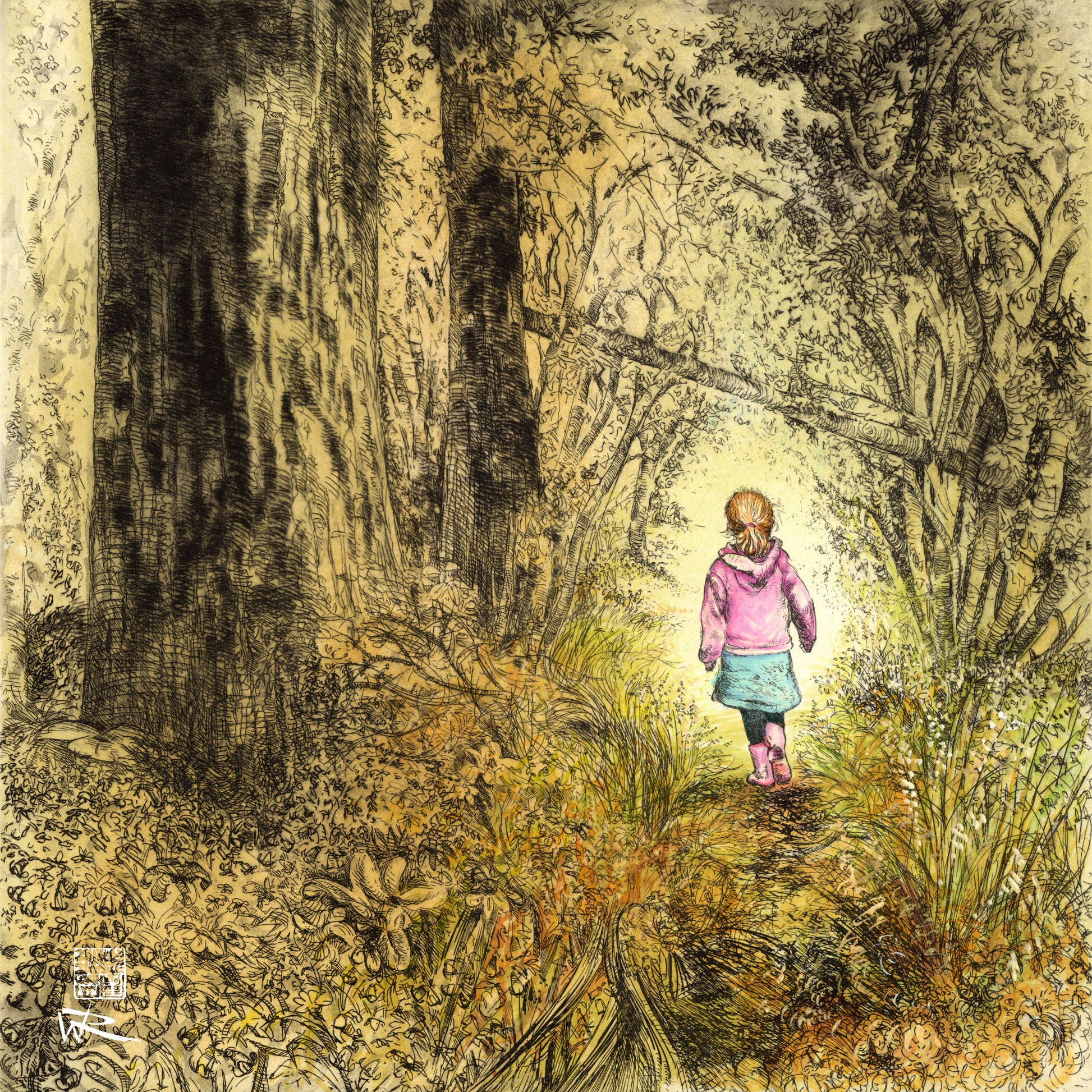 The original etching was inspired by my daughter walking through the woods ahead of me when she was young. It is a limited edition etching hand printed on the Rochat press in the studio at Oxford Printmakers.