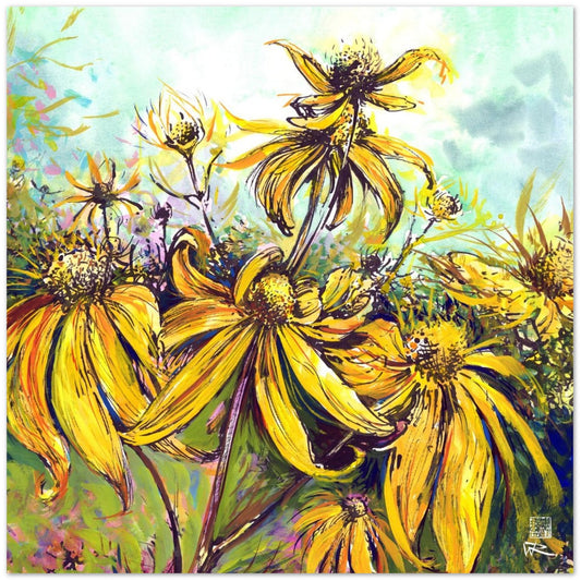 Print on fine art paper reproduction of a painting of bright yellow rudbekia flowers from a triptych of paintings of the walled garden at Rousham in oxfordshire. The inspiration I was walking through the walled garden...