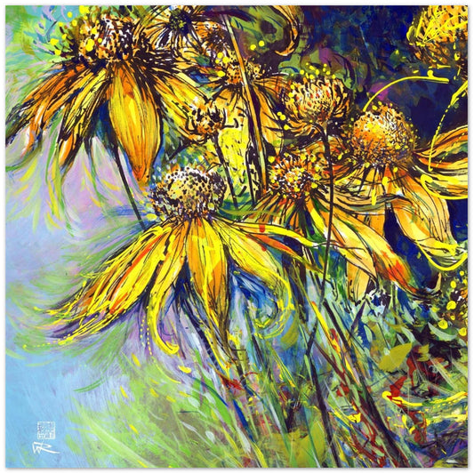 This canvas print is a reproduction of a painting of Rudbekias triptych 1. Rudbekias triptych 1 is the first piece of a striking triptych of 3; it complements the other two paintings to create a captivating visual story.