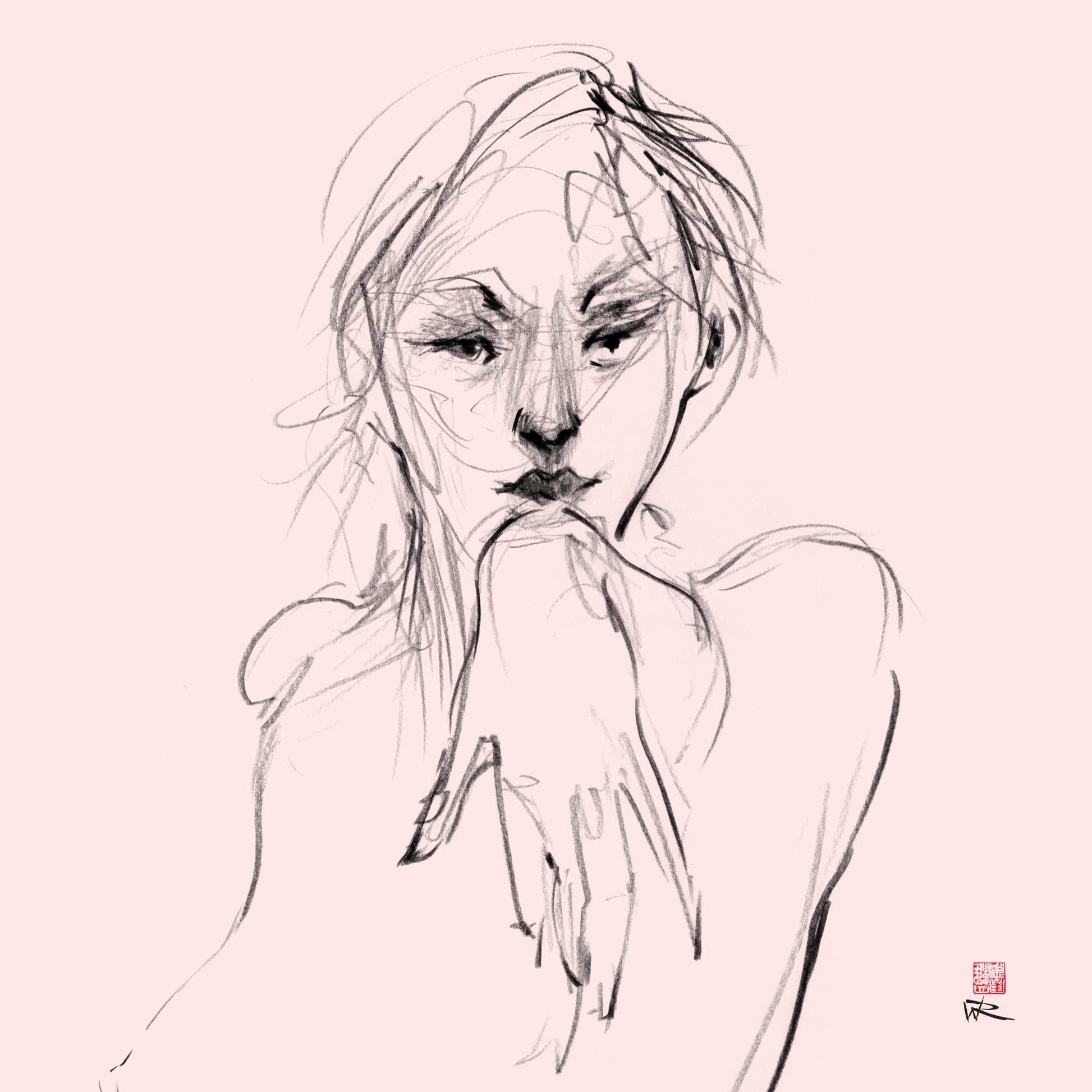 This canvas print is a reproduction of a lie drawing of Mano who directed her full gaze at me with a come hither look. Drawn in a fast pase in 10minutes which gives the drawing energy and abbreviation.