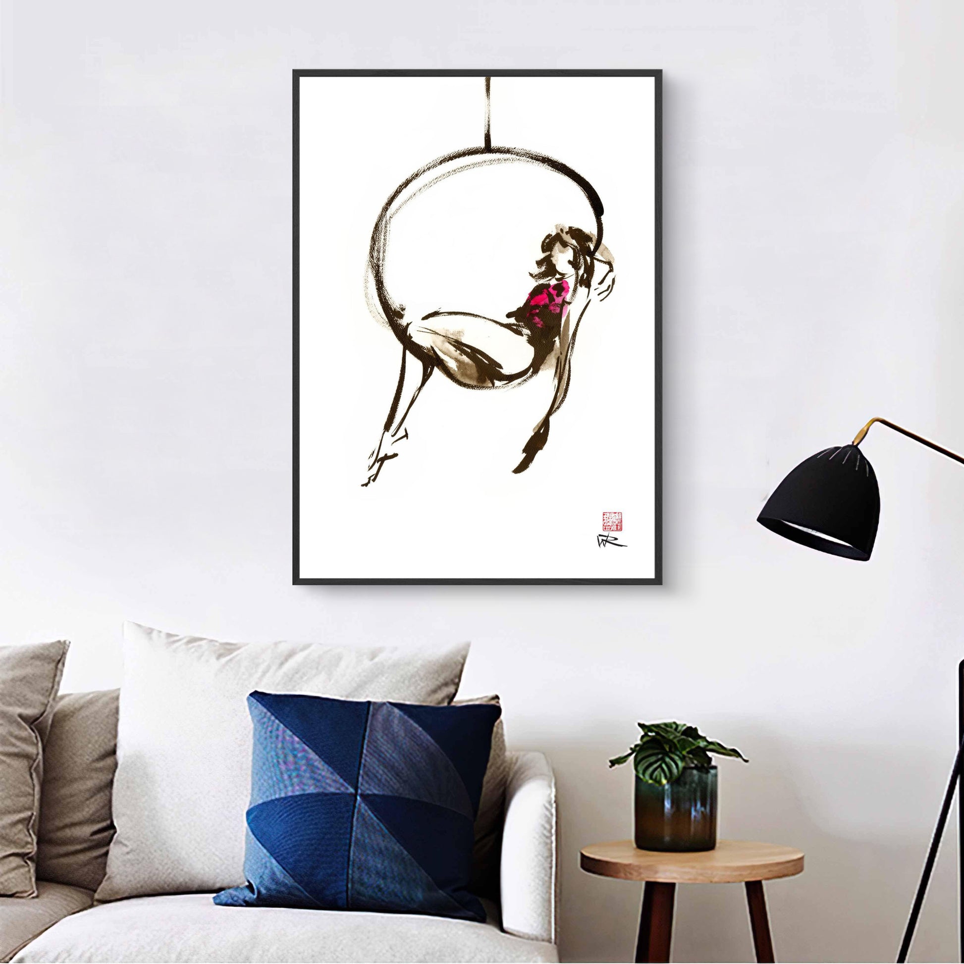 Visualise this unique figurative contemporary ink figure painting in your living space. Painted in a sophisticated graphic style using black ink and brush of a girl sitting in a hoop. Its beauty is defined by its simplicity and reproduced as a high quality print on fine art paper.