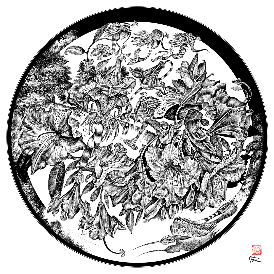 Image: Metaflora, imagined meta beasts inspired by Rhododendron flowers (pen and ink on board)