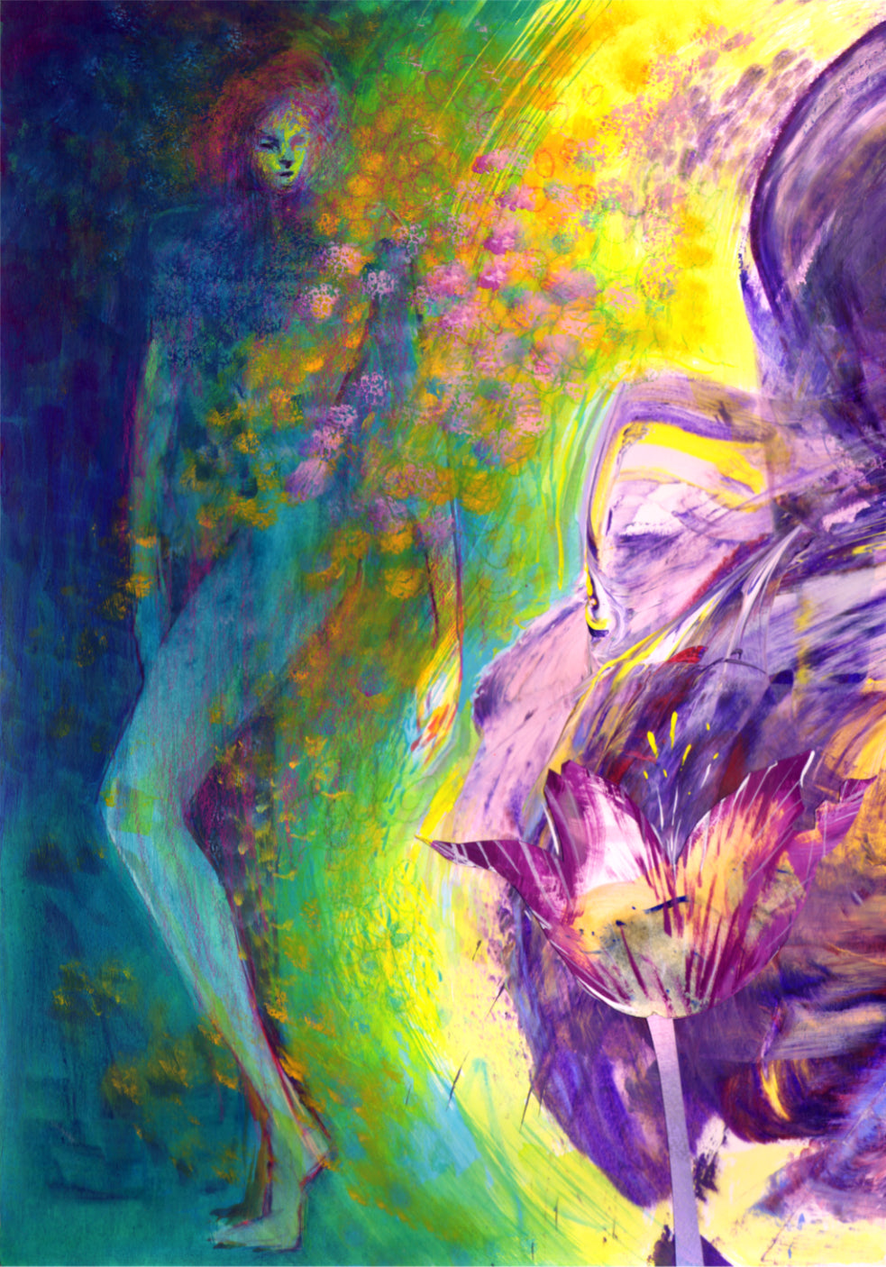 “Hiding amongst the tulips” is a sophisticated exploration of form and media, blending floral motifs with figurative elements. This artwork emerges from an inventive process of cropping large-scale paintings and layering floral collages sourced from diverse materials. The piece invites viewers to discover the concealed figure subtly integrated within a vibrant tulip landscape, challenging perceptions and revealing depth through texture and composition. Its nuanced interplay of abstraction and representation offers a contemplative experience that celebrates the harmony between natural beauty and hidden narratives.