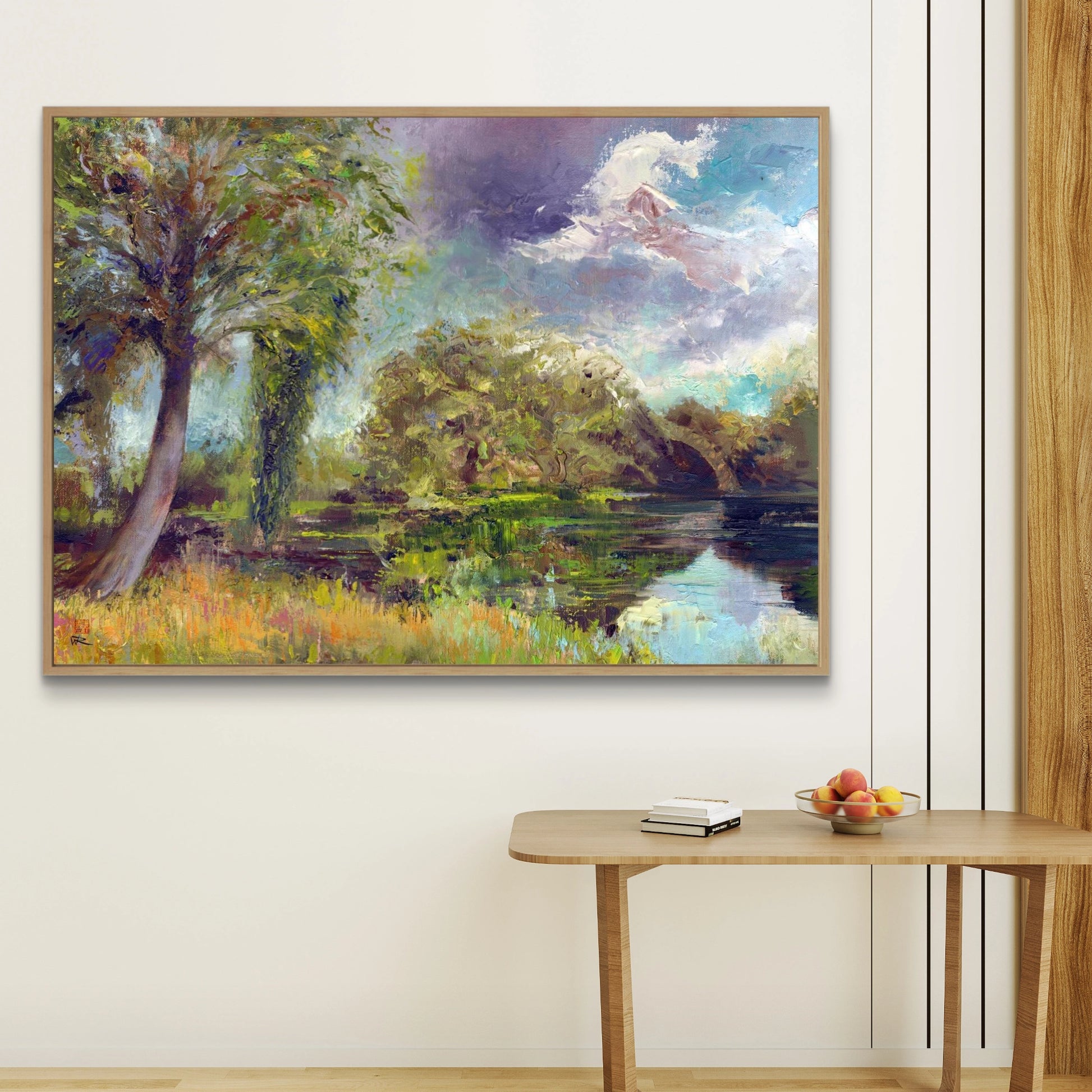 Canvas art print of an oil painting of Wotton lake in Buckinghamshire by William Rowsell on a sitting room wall