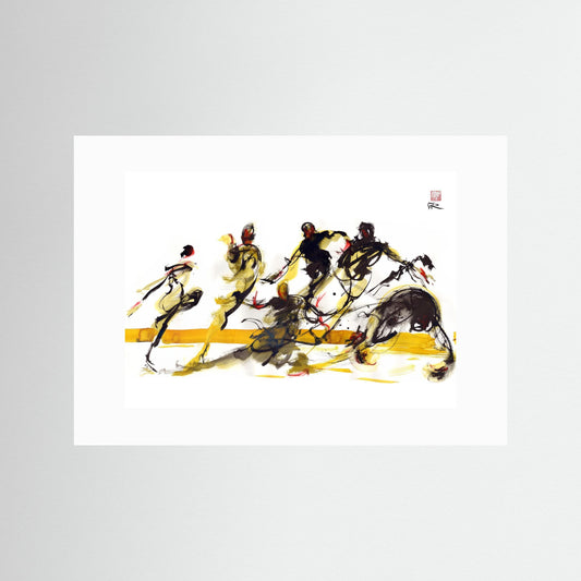 This fine art paper print is a reproduction of a painting of New York contemporary dancers, captured during a live online session. The original was painted in inks and watercolour on paper. It conveys the dynamic energy and fluid movement of the dancers, painted in real-time to preserve the authenticity...