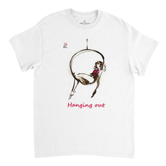 This T-shirt is a reproduction of Hanging out. The original painting captured a girl sitting in a hoop painted in black ink in a gestural graphic style. Inspiration I painted this image live at The Drawing Circus, the artwork captures a moment of quiet elegance and movement. Painted with a...