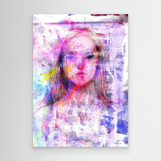 Canvas art print reproduction of a composite portrait drawing of my favourite model, Manko. The original drawing was captured in a 30 min pose in coloured pencils on paper. I then created this digital composite from the original drawing and other texture paintings. This results in a high energy image...