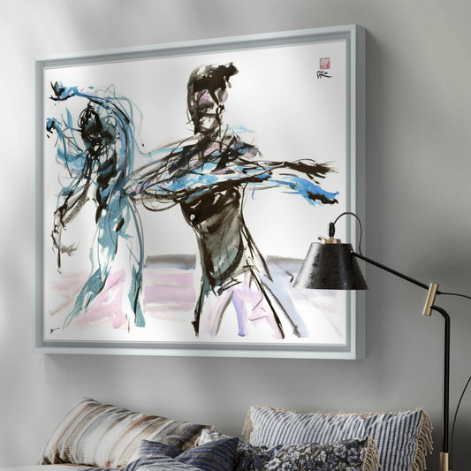 Print on fine art paper reproduction of a painting capturing the movement of two live dancers showing the connection between their physical expression. Created using bold black and blue gestural brushstrokes captured with Chinese inks on paper. The inspiration This painting was captured while I was at The Royal...