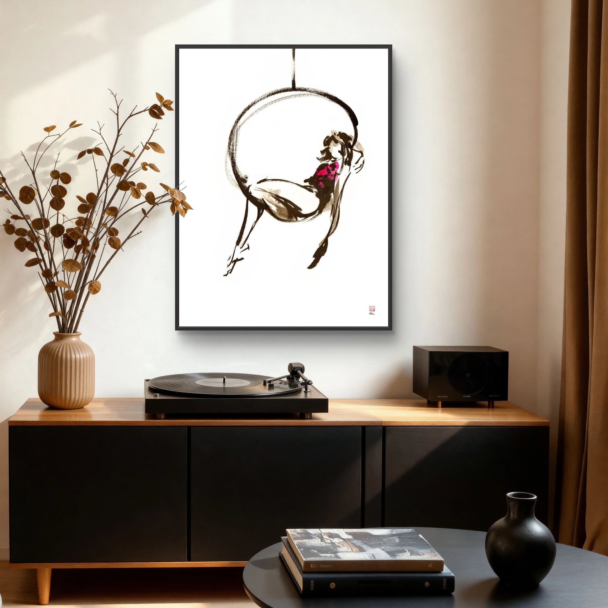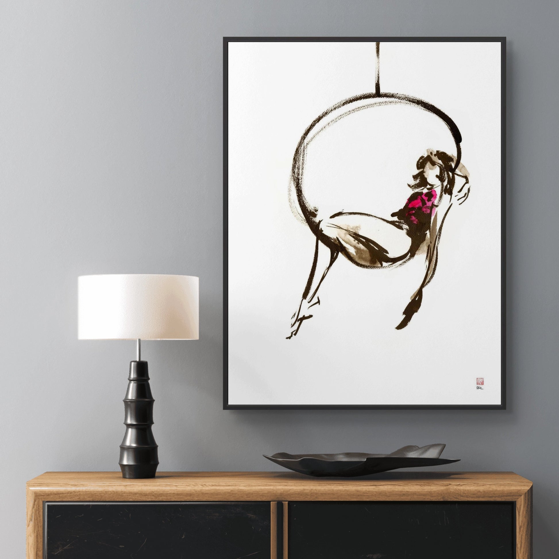 This canvas print features a refined gestural ink painting depicting a girl perching inside a suspended hoop. I painted this live at The Drawing Circus where I saw a trapese artist moving within a suspended hoop.