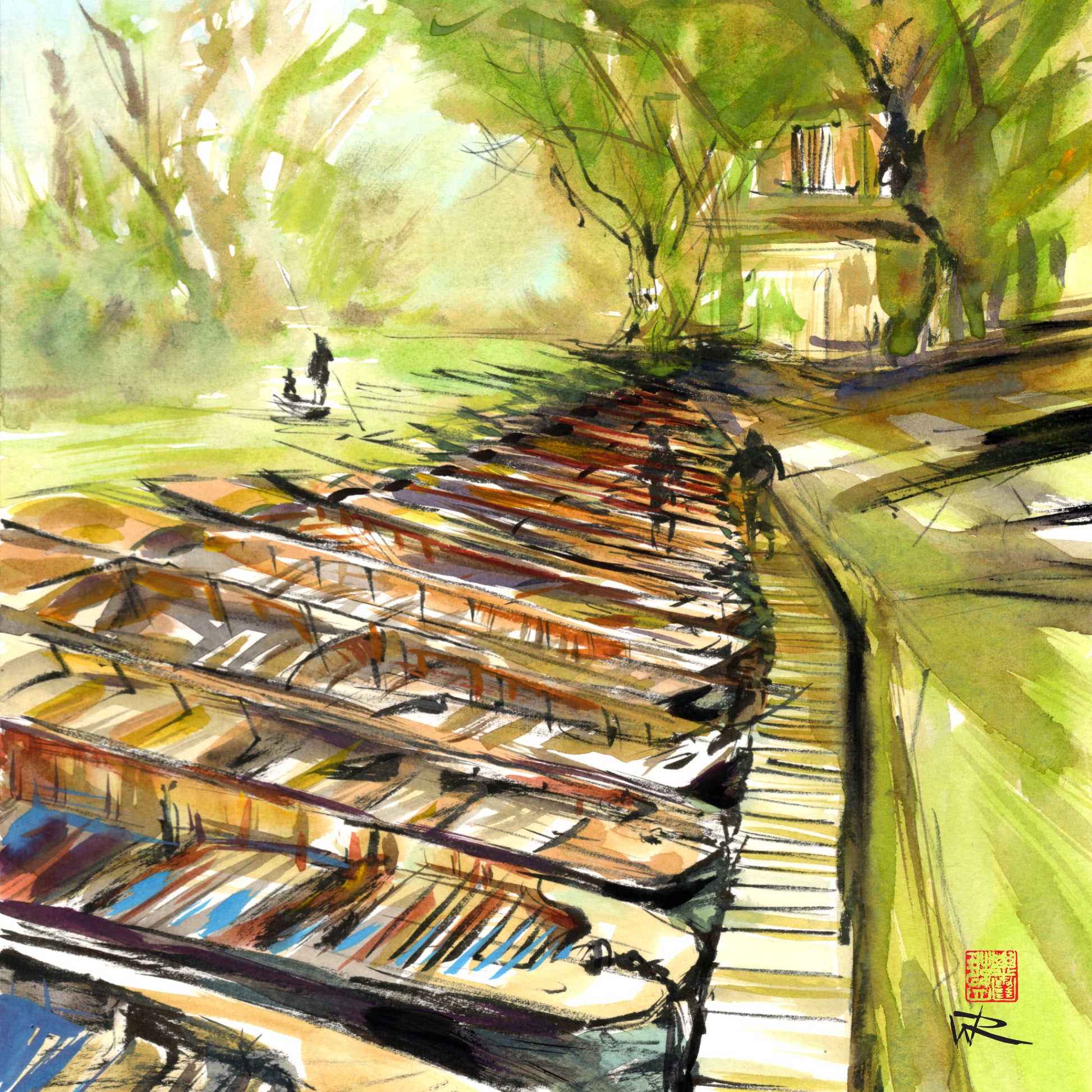 I was inspired to paint this view of the punts on the river Cherwell having observed a couple having a punting lesson. There was a lot of screaming and arguing going on as they tried their best not to fall in. The view down the rows of punts moored along the river is just too good to pass up - a composition ready and waiting to capture.